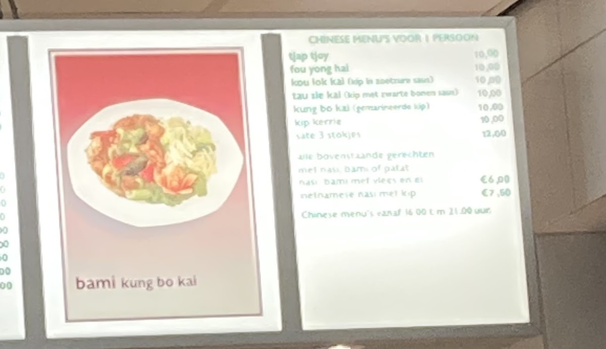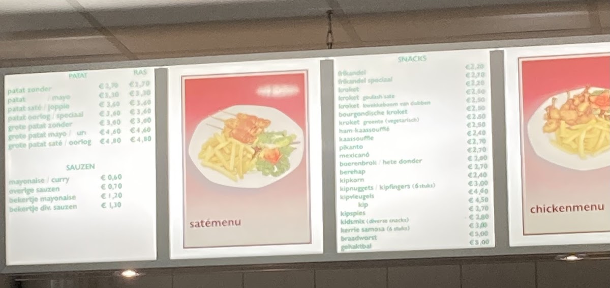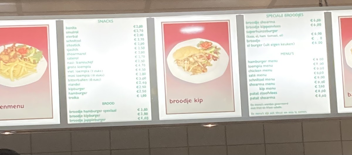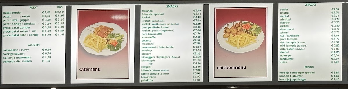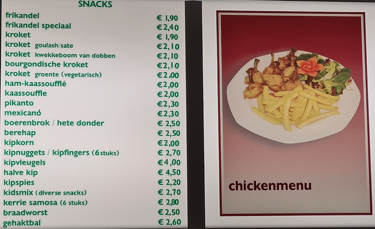 The menu at this cafeteria and fast food restaurant in Groningen offers a selection of typical snack bar items suitable for quick meals and casual dining. Visitors can expect a range of fast food options including fries, burgers, and other common snacks. The menu is structured to accommodate customers seeking light meals or snacks, as well as those looking to order food quickly.